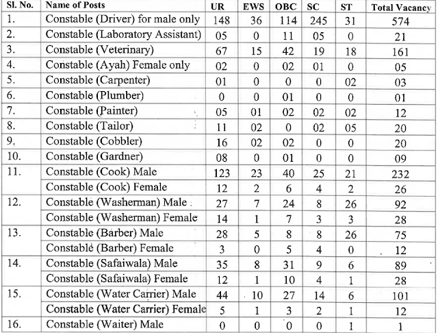 কনস্টেবল (ড্রাইভার, ল্যাবরেটরি অ্যাসিস্ট্যান্ট, ভেটেনারি, কার্পেন্টার, পাম্বলার, পেইন্টার, টেইলর, কবলার, গার্ডেনার, কুক, ওয়াশারম্যান, বারবার, সাফাইওয়ালা, ওয়াটার ক্যারিয়ার এবং ওয়েটার পদের ক্ষেত্রে)-