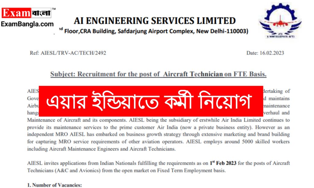 কেন্দ্রীয় সরকারের এয়ার ইন্ডিয়া ইঞ্জিনিয়ারিং সার্ভিস লিমিটেডে টেকনিশিয়ান পদে কর্মী নিয়োগের বিজ্ঞপ্তি প্রকাশ করা হয়েছে। যেকোনো ভারতীয় নাগরিক অর্থাৎ পশ্চিমবঙ্গের যেকোনো জেলার প্রার্থীরা এখানে আবেদন করতে পারবেন। আবেদন পদ্ধতি শিক্ষাগত যোগ্যতা সহ বিস্তারিত জানতে নিচে রইলো আজকের এই প্রতিবেদন।