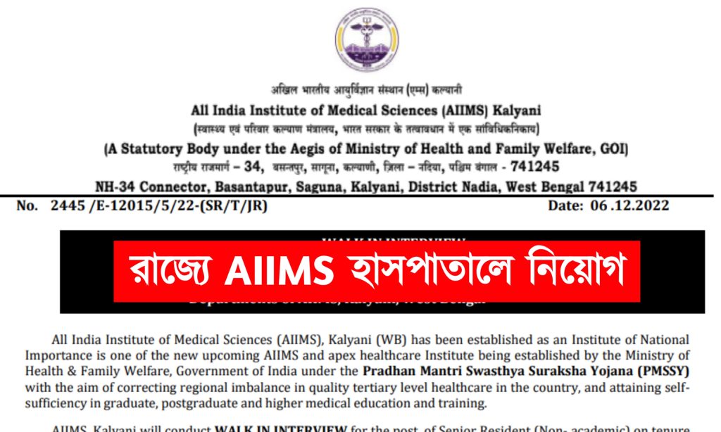 অল ইন্ডিয়া ইনস্টিটিউট অফ মেডিকেল সাইন্স (AIIMS) -এর তরফে রাজ্যে সিনিয়র রেসিডেন্ট পদে নিয়োগের বিজ্ঞপ্তি প্রকাশ করা হয়েছে। যেকোনো ভারতীয় নাগরিক অর্থাৎ পশ্চিমবঙ্গের যেকোনো জেলার প্রার্থীরা এখানে আবেদন করতে পারবেন। আবেদন পদ্ধতি শিক্ষাগত যোগ্যতা সহ বিস্তারিত জানতে নিচে রইলো আজকের এই প্রতিবেদন।