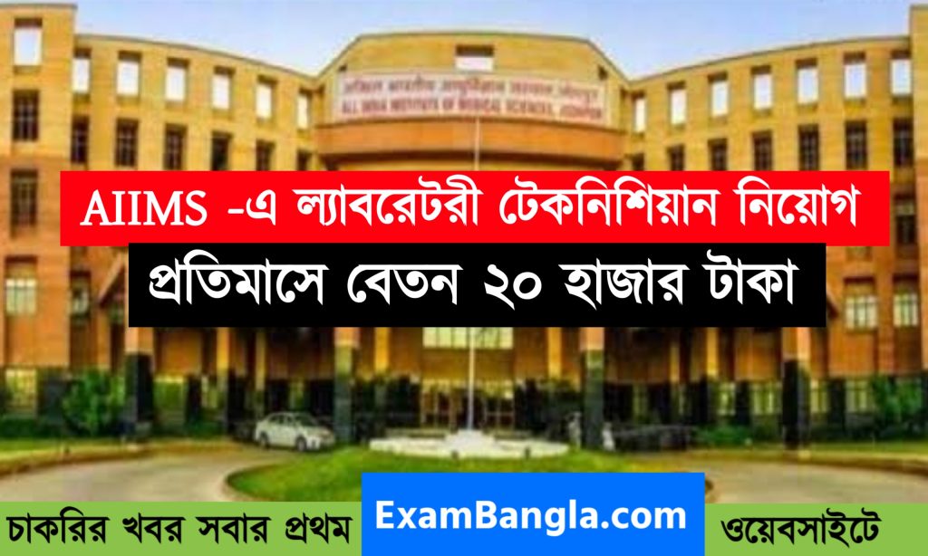 কেন্দ্রীয় সরকারের অধীনস্থ অল ইন্ডিয়া ইনস্টিটিউট অব মেডিকেল সাইন্সের তরফে ল্যাবরেটরি টেকনিশিয়ান পদে নিয়োগের বিজ্ঞপ্তি প্রকাশ করা হয়েছে। উচ্চমাধ্যমিক পাশে আবেদন করতে পারবেন। যেকোনো ভারতীয় নাগরিক অর্থাৎ পশ্চিমবঙ্গের যেকোনো জেলা থেকে প্রার্থীরা আবেদন করতে পারবেন। আবেদন পদ্ধতি শিক্ষাগত যোগ্যতা, বেতন সহ বিস্তারিত জানতে নিচে রইলো আজকের এই প্রতিবেদন।