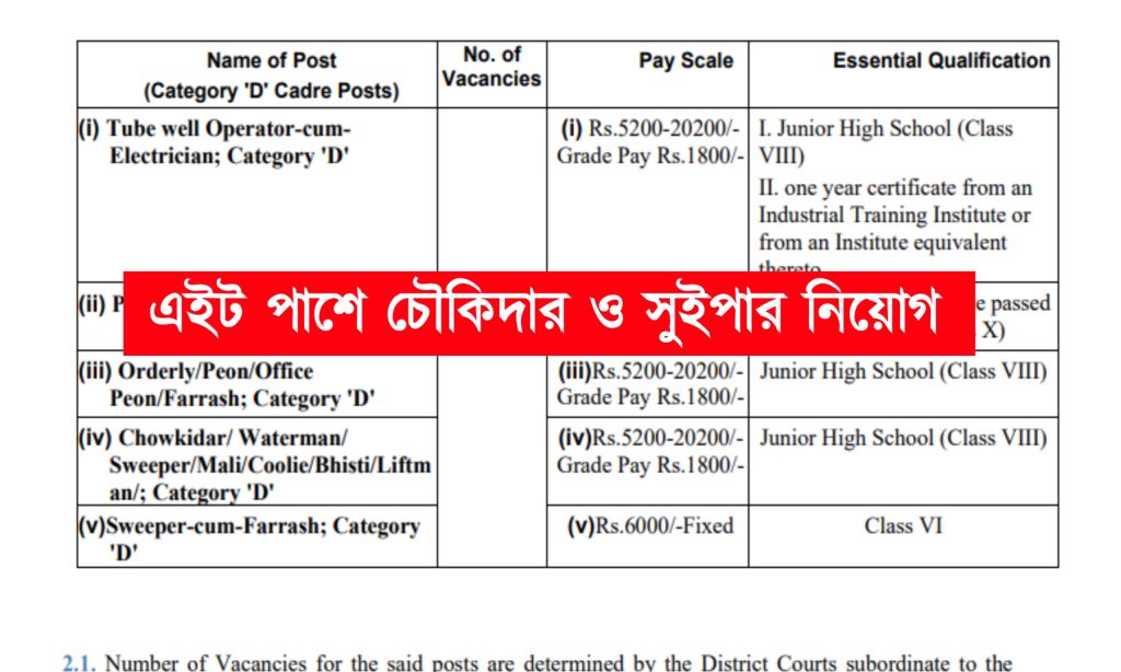 পদের নাম- Chowkidar/ Waterman/ Sweeper/ Mali/ Coolie/ Bhisti/ Leftman