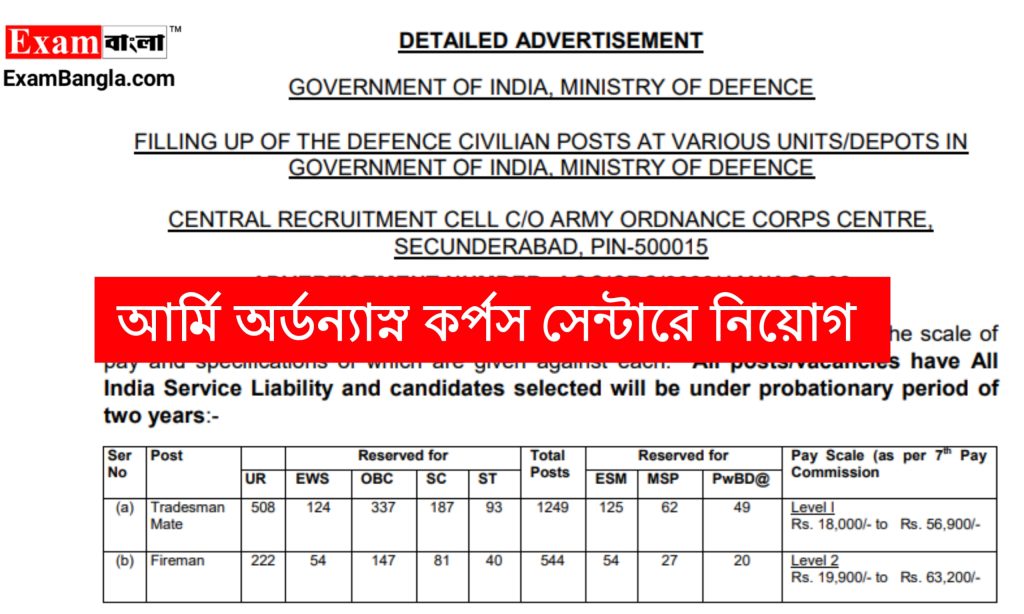 কেন্দ্রীয় সরকারের আর্মি অর্ডন্যাস্ন কর্পস সেন্টার (AOC) -এ মাধ্যমিক পাশে কর্মী নিয়োগের বিজ্ঞপ্তি প্রকাশ করা হয়েছে। যেকোনো ভারতীয় নাগরিক অর্থাৎ পশ্চিমবঙ্গের যেকোনো জেলার প্রার্থীরা এখানে আবেদন করতে পারবেন। আবেদন পদ্ধতি শিক্ষাগত যোগ্যতা সহ বিস্তারিত জানতে নিচে রইলো আজকের এই প্রতিবেদন।