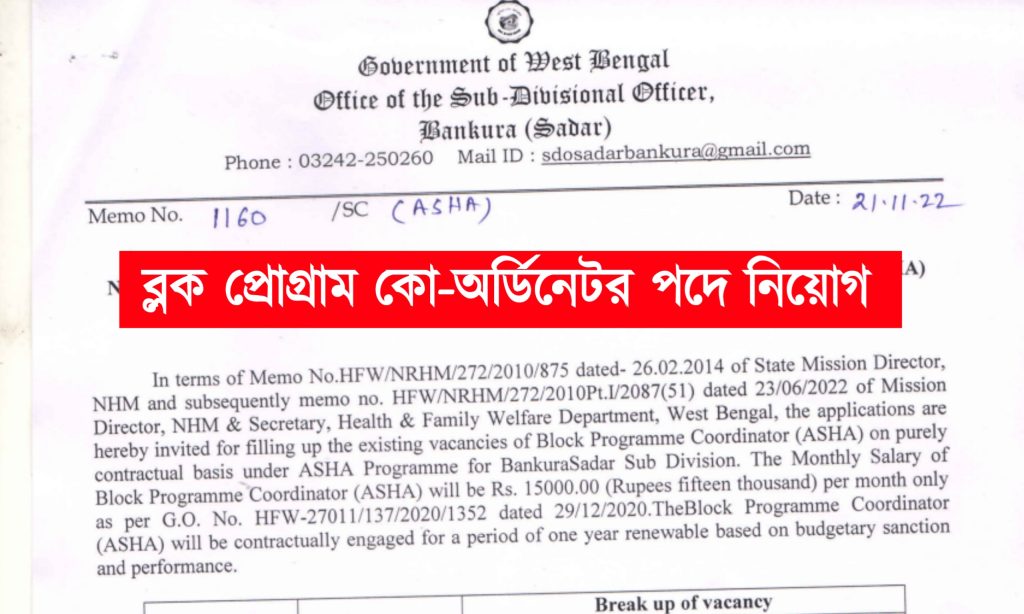 পদের নাম- ব্লক প্রোগ্রাম কো-অর্ডিনেটর (আশা)।
