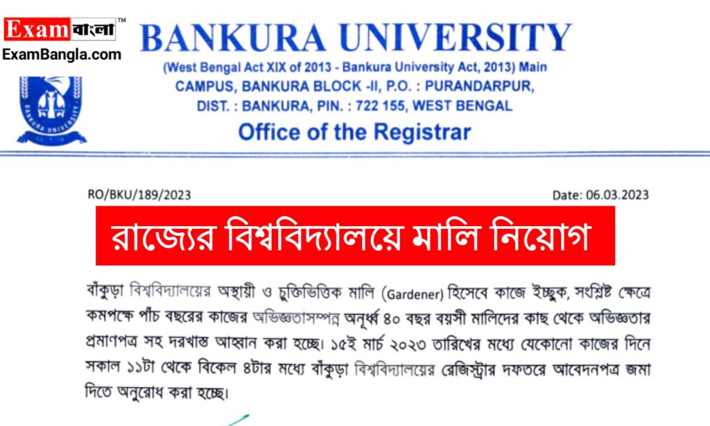রাজ্যের বাঁকুড়া ইউনিভার্সিটিতে চুক্তিভিত্তিতে মালি পদে কর্মী নিয়োগের বিজ্ঞপ্তি প্রকাশ করা হয়েছে। যেকোনো ভারতীয় নাগরিক অর্থাৎ পশ্চিমবঙ্গের যেকোনো জেলার প্রার্থীরা এখানে আবেদন করতে পারবেন। আবেদন পদ্ধতি শিক্ষাগত যোগ্যতা সহ বিস্তারিত জানতে নিচে রইলো আজকের এই প্রতিবেদন।