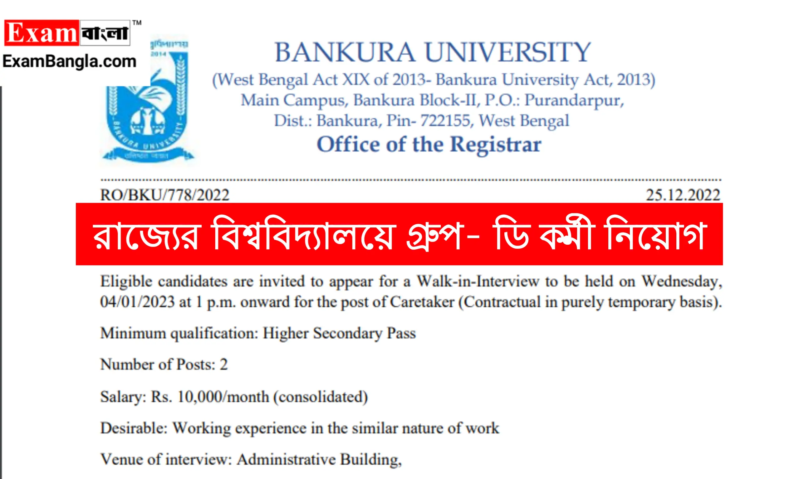 ইন্টারভিউয়ের স্থান- Administrative Building, 2nd Floor, Main Campus, Bankura University.