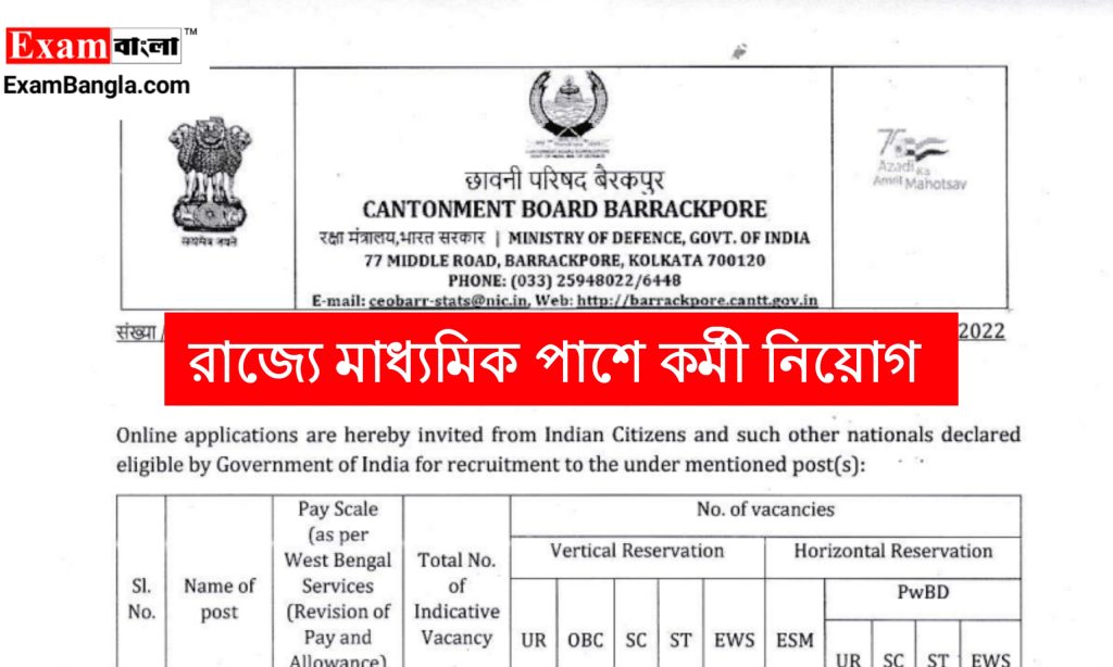 রাজ্যের চাকরির প্রার্থীদের জন্য সুখবর। ক্যান্টনমেন্ট বোর্ডের তরফে পাম্প অপারেটর, লেবার, মিটার রিডার সহ বিভিন্ন পদে কর্মী নিয়োগের বিজ্ঞপ্তি প্রকাশ করা হয়েছে। মাধ্যমিক পাশে পুরুষ মহিলা উভয়ই প্রার্থীরা আবেদন করতে পারবেন। আবেদন পদ্ধতি শিক্ষাগত যোগ্যতা সহ বিস্তারিত জানতে নিচে রইলো আজকের এই প্রতিবেদন। যেকোনো ভারতীয় নাগরিক অর্থাৎ পশ্চিমবঙ্গের যেকোনো জেলার প্রার্থীরা এখানে আবেদন করতে পারবেন।