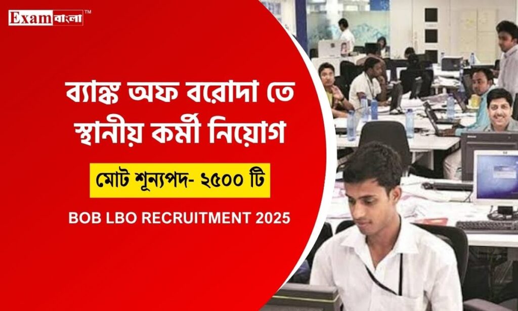 BOB Recruitment 2025: ব্যাংকের চাকরিপ্রার্থীদের জন্য দুর্দান্ত সুখবর প্রকাশ করল ব্যাংক অফ বরোদা, যেখানে ২৫০০ পদের স্থানীয় এলাকার ব্যাংক ব্রাঞ্চে কর্মী হিসেবে নিযুক্ত হওয়ার সুযোগ রয়েছে। যে কোন বিষয়ে গ্র্যাজুয়েট চাকরিপ্রার্থীরা এই পদে সরাসরি আবেদন জানাতে পারবেন। তবে এক্ষেত্রে আবেদনে ইচ্ছুক চাকরিপ্রার্থী থেকে অবশ্যই স্থানীয় ভাষায় যথেষ্ট পরিমাণে দক্ষ হতে হবে। পশ্চিমবঙ্গ সহ ভারতবর্ষের একাধিক রাজ্যের ব্যাঙ্ক অফ বরোদা ব্রাঞ্চে চাকরি প্রার্থীদের নিয়োগের সুযোগ রয়েছে। তাই এই নিয়োগ সংক্রান্ত বিস্তারিত তথ্য অর্থাৎ পদের বিবরণ এবং আবেদনের যোগ্যতা ও নিয়োগ পদ্ধতি বুঝে নিতে শেষ পর্যন্ত পড়তে হবে আজকের প্রতিবেদনটি।