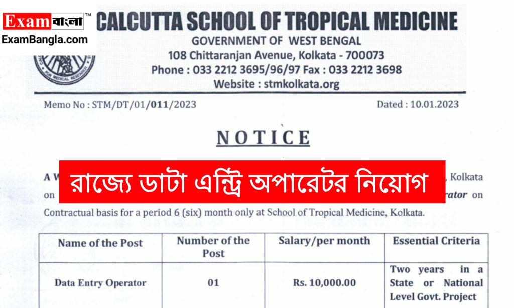 রাজ্যের চাকরি প্রার্থীদের জন্য সুখবর। রাজ্যে নতুন করে কলকাতা স্কুল অফ ট্রপিক্যাল মেডিসিনের তরফে ডাটা এন্ট্রি অপারেটর পদে কর্মী নিয়োগের বিজ্ঞপ্তি প্রকাশ করা হয়েছে। সরাসরি ইন্টারভিউ দিয়ে চাকরির সুযোগ। আবেদন পদ্ধতি শিক্ষাগত যোগ্যতা সহ সহ বিস্তারিত জানতে নিচে রইলো আজকের এই প্রতিবেদন।