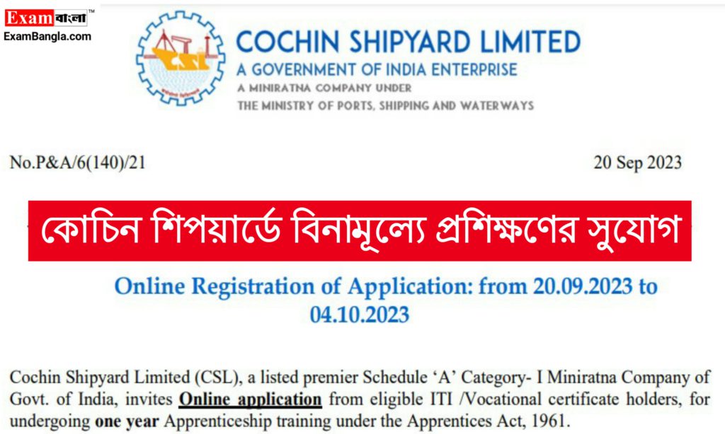 আবেদন পদ্ধতি- ইচ্ছুক এবং যোগ্য চাকরিপ্রার্থীদের অনলাইনের মাধ্যমে নিজেদের আবেদন নথিভুক্ত করতে হবে। সেক্ষেত্রে সংস্থার অফিশিয়াল ওয়েবসাইট www.cochinshipyard.com ভিজিট করতে হবে। তারপর নির্দিষ্ট উইন্ডো থেকে নির্দেশ অনুযায়ী স্টেপ বাই স্টেপ অনলাইন আবেদনপত্র পূরণ করতে হবে।