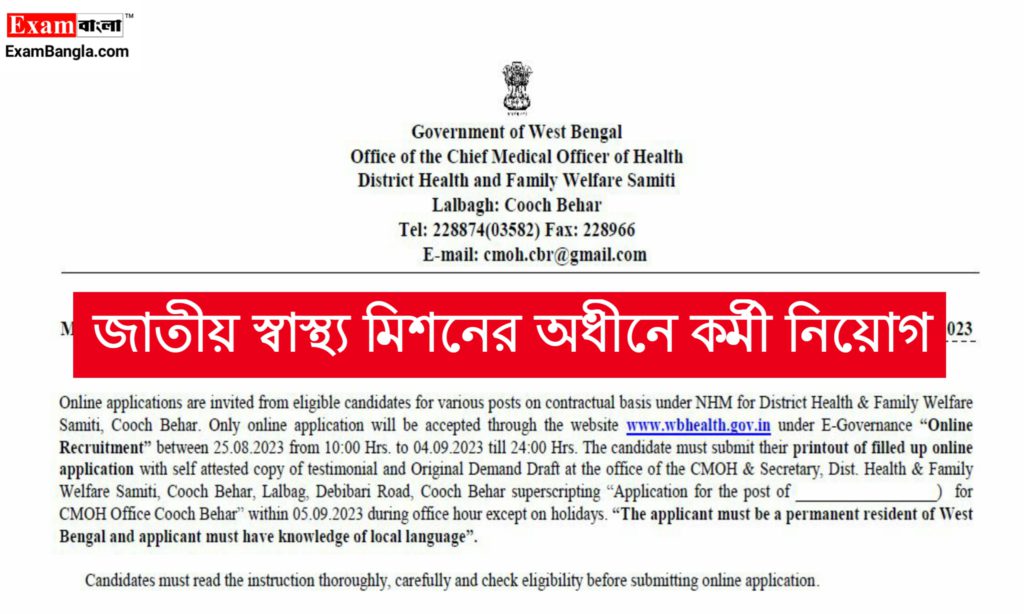 আবেদন ফি- আবেদন ফি বাবদ GEN, OBC, EWS প্রার্থীদের ক্ষেত্রে ১০০/- টাকা ও SC, ST, PWD প্রার্থীদের ক্ষেত্রে ৫০/- টাকা ধার্য করা হয়েছে। আবেদন ফি জমা করা যাবে “DH&FWS NON NHM MOTHER A/C COOCH BEHAR” ডিমান্ড ড্রাফটের মাধ্যমে।