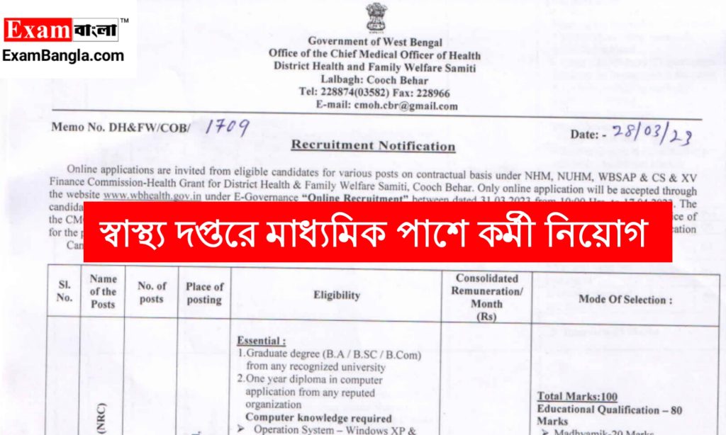 আবেদনপত্র জমা দেওয়ার ঠিকানা- Office of the CMOH & Secretary, District Health & Family Welfare Samiti, Coochbehar, Lalbagh, Debibari Road Coochbehar.