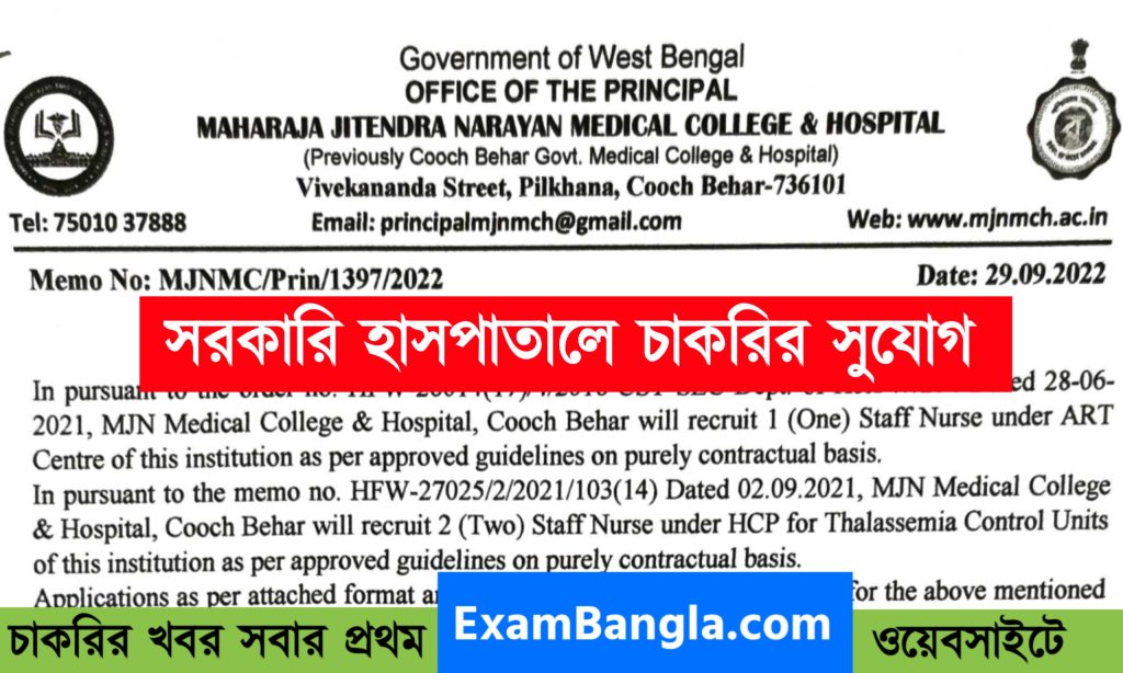 নিয়োগ স্থান- কোচবিহার জেলার মহারাজা জিতেন্দ্র নারায়ণ মেডিকেল কলেজ এন্ড হাসপাতালে প্রার্থীদের নিয়োগ করা হবে।