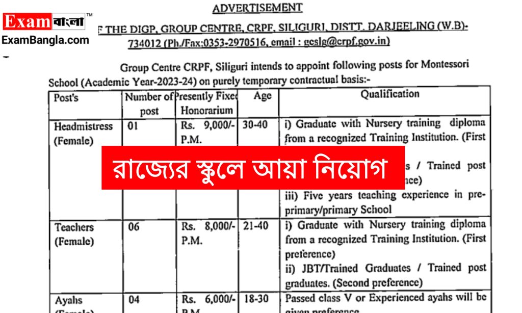 রাজ্যে সেন্ট্রাল রিসার্ভ পুলিশ ফোর্সে পঞ্চম শ্রেণী পাশে আয়া সহ বিভিন্ন পদে নিয়োগের বিজ্ঞপ্তি প্রকাশ করা হয়েছে। যেকোনো ভারতীয় নাগরিক অর্থাৎ পশ্চিমবঙ্গের যেকোনো জেলার প্রার্থীরা এখানে আবেদন করতে পারবেন। আবেদন পদ্ধতি শিক্ষাগত যোগ্যতা সহ বিস্তারিত জানতে নিচে রইলো আজকের এই প্রতিবেদন।