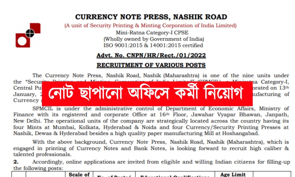 কারেন্সি নোট প্রেসের তরফে সুপারভাইজার ও জুনিয়ার টেকনিশিয়ান পদে কর্মী নিয়োগের বিজ্ঞপ্তি প্রকাশ করা হয়েছে। যেকোনো ভারতীয় নাগরিক অর্থাৎ পশ্চিমবঙ্গের যেকোনো জেলার প্রার্থীরা এখানে আবেদন করতে পারবেন। আবেদন পদ্ধতি শিক্ষাগত যোগ্যতা সহ বিস্তারিত জানতে নিচে রইলো আজকের এই প্রতিবেদন।