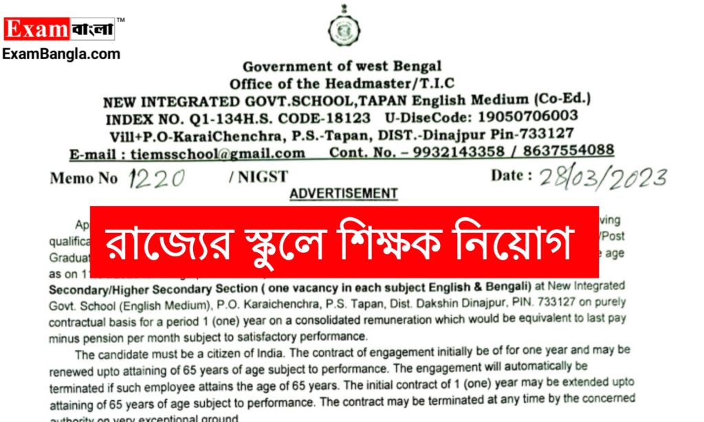 রাজ্যে ইংলিশ মিডিয়াম স্কুলে অ্যাসিস্ট্যান্ট টিচার নিয়োগের বিজ্ঞপ্তি প্রকাশ করা হয়েছে। যেকোনো ভারতীয় নাগরিক অর্থাৎ পশ্চিমবঙ্গের যেকোনো জেলার প্রার্থীরা এখানে আবেদন করতে পারবেন। আবেদন পদ্ধতি শিক্ষাগত যোগ্যতা সহ বিস্তারিত জানতে নিচে রইলো আজকের এই প্রতিবেদন।