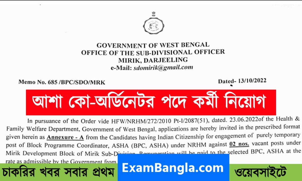 আবেদনপত্র পাঠানোর ঠিকানা- To the Member Of Secretary, Asha Selection Committee. Office of the Sub-division Officer, Mirik, P.o- Mirik, Dist. Darjeeling, West Bengal, Pin- 734214