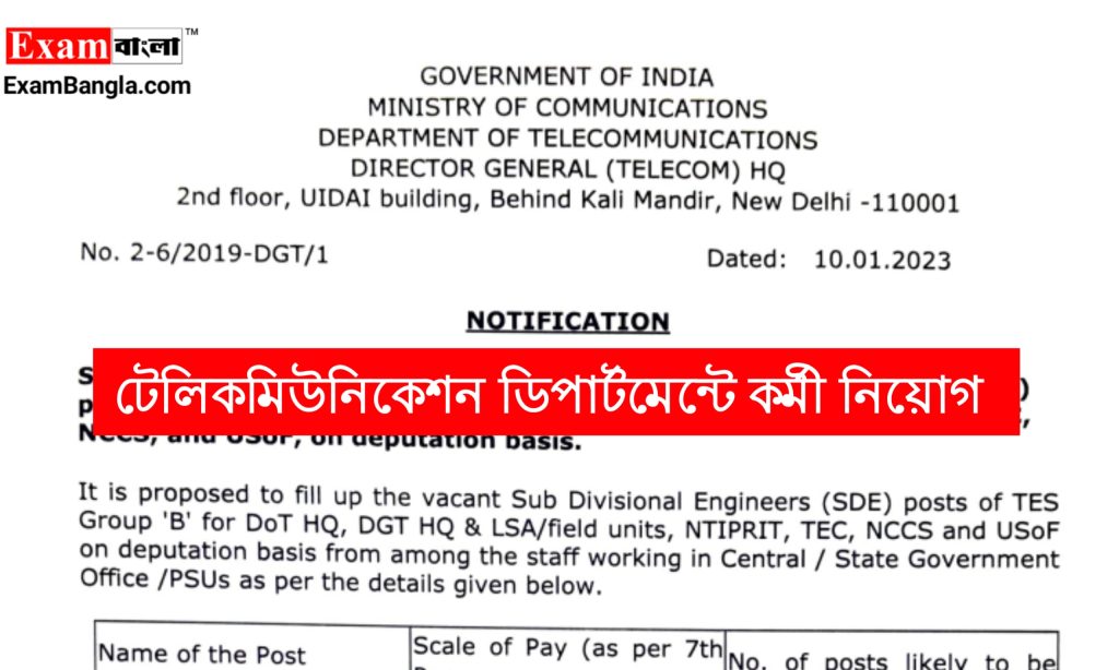 ভারত সরকারের টেলি কমিউনিকেশন দপ্তরে সাব ডিভিশনাল ইঞ্জিনিয়ার নিয়োগের বিজ্ঞপ্তি প্রকাশ করা হয়েছে। যেকোন ভারতীয় নাগরিক অর্থাৎ পশ্চিমবঙ্গের যেকোনো জেলার প্রার্থীরা এখানে আবেদন করতে পারবেন। আবেদন পদ্ধতি শিক্ষাগত যোগ্যতা সহ বিস্তারিত জানতে নিচে রইলো আজকের এই প্রতিবেদন।