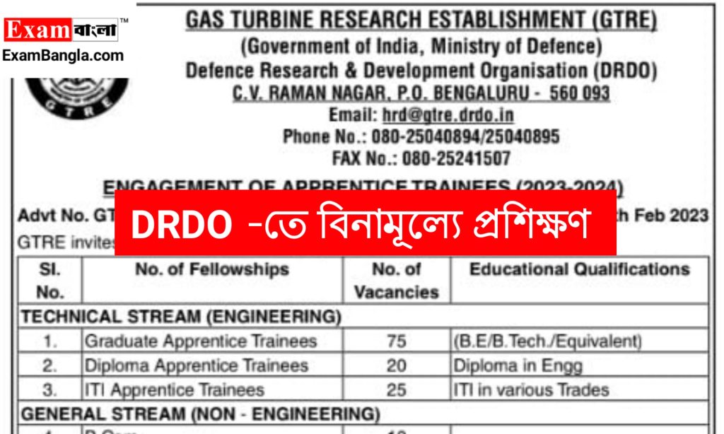 ডিফেন্স রিসার্চ ডেভলপমেন্ট অর্গানাইজেশন (DRDO) -এর মাধ্যমে বিনামূল্যে প্রশিক্ষণের মাধ্যমে নিয়োগের বিজ্ঞপ্তি প্রকাশ করা হয়েছে। যেকোনো ভারতীয় নাগরিক অর্থাৎ পশ্চিমবঙ্গের যেকোনো জেলার প্রার্থীরা এখানে আবেদন করতে পারবেন। আবেদন পদ্ধতি, শিক্ষাগত যোগ্যতা সহ বিস্তারিত জানতে নিচে রইলো আজকের এই প্রতিবেদন।