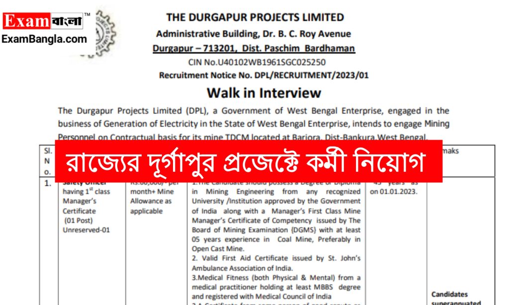 দুর্গাপুর প্রজেক্ট লিমিটেডের তরফে রাজ্যে সেফটি অফিসার পদে কর্মী নিয়োগের বিজ্ঞপ্তি প্রকাশ করা হয়েছে। যেকোনো ভারতীয় নাগরিক অর্থাৎ পশ্চিমবঙ্গের যেকোনো জেলার প্রার্থীরা এখানে আবেদন করতে পারবেন। আবেদন পদ্ধতি শিক্ষাগত যোগ্যতা সহ বিস্তারিত জানতে নিচে রইলো আজকের এই প্রতিবেদন। সরাসরি ইন্টারভিউয়ের মাধ্যমে চাকরির সুযোগ।