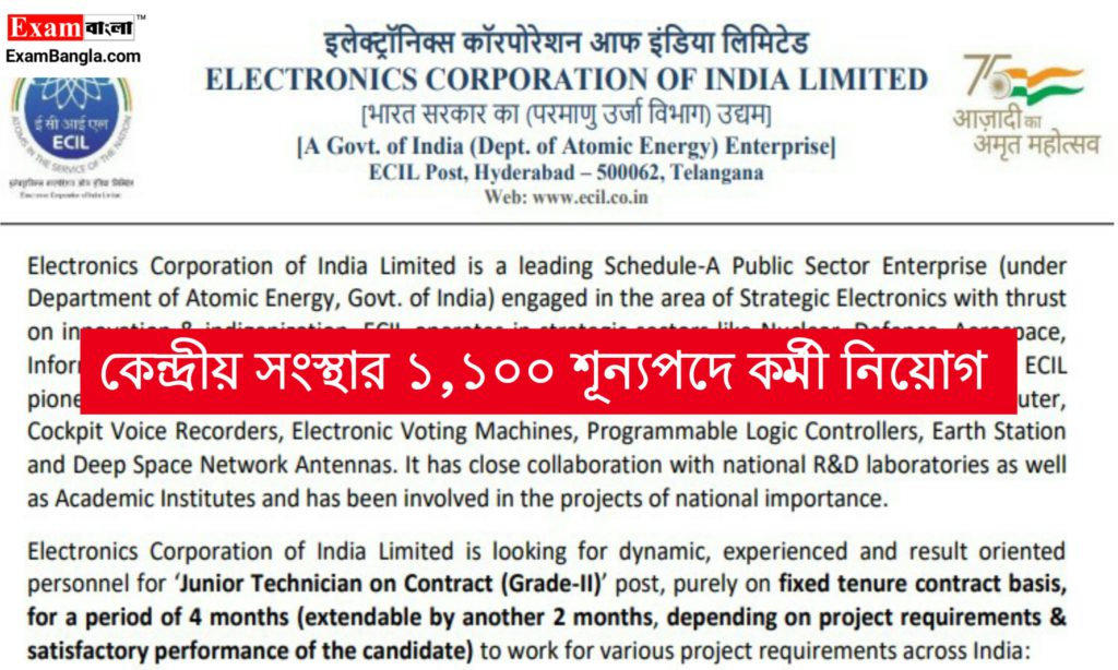 ইলেকট্রনিক্স কর্পোরেশন অফ ইন্ডিয়া লিমিটেডে জুনিয়র টেকনিশিয়ান নিয়োগের বিজ্ঞপ্তি প্রকাশিত হল। প্রকাশিত বিজ্ঞপ্তি অনুযায়ী ১ হাজারের কিছু বেশি শূন্যপদে এই নিয়োগ করা হবে। শুরুতেই বেতন থাকবে ২২ হাজার টাকা। যেকোনো ভারতীয় নাগরিক অর্থাৎ পশ্চিমবঙ্গের ২৩ টি জেলার চাকরিপ্রার্থীরা এখানে আবেদন জানাতে পারবেন। শিক্ষাগত যোগ্যতা, আবেদন পদ্ধতি, নিয়োগ প্রক্রিয়া ইত্যাদি বিস্তারিত তথ্য উল্লেখ করা হল আজকের প্রতিবেদনে।
