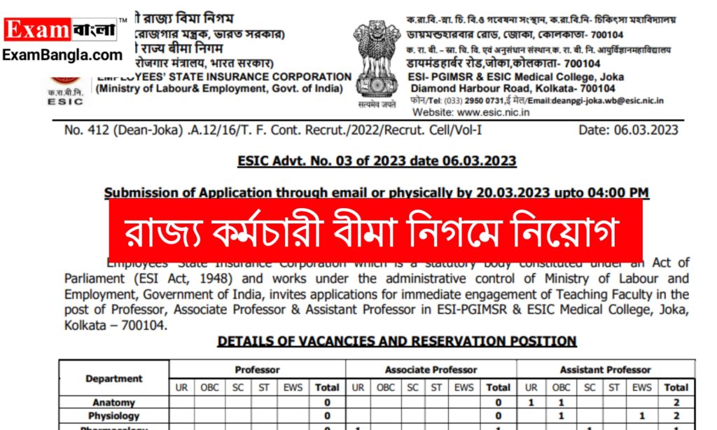 রাজ্যে কর্মচারী বিমা নিগমে (ESIC) -এর মাধ্যমে প্রফেসর, অ্যাসিস্ট্যান্ট প্রফেসর, অ্যাসোসিয়েট প্রফেসর নিয়োগের বিজ্ঞপ্তি প্রকাশ করা হয়েছে। যেকোনো ভারতীয় নাগরিক অর্থাৎ পশ্চিমবঙ্গের যেকোনো জেলার প্রার্থীরা এখানে আবেদন করতে পারবেন। আবেদন পদ্ধতি শিক্ষাগত যোগ্যতা সহ বিস্তারিত জানতে নিচে রইলো আজকের এই প্রতিবেদন।