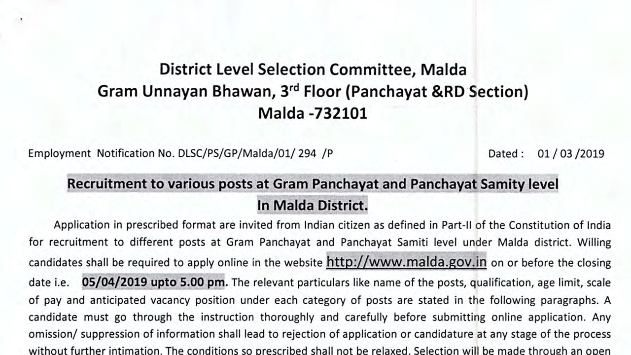 Application are invited from a prescribed format to the various posts at Gram Panchayat and Panchayat Samity level in Mlada District. Male and Female candidates areb eligible to apply. Willing candidates shall be required to apply online in the officicl website of Malda District i,e; www.malda.gov.in on or before the closing date 5thApril, 2019 upto 5.00 PM. The candidates are requested to go through the official notification thoroughly and carefully before submitting online application. All the posts will initially be made on temporary basis.