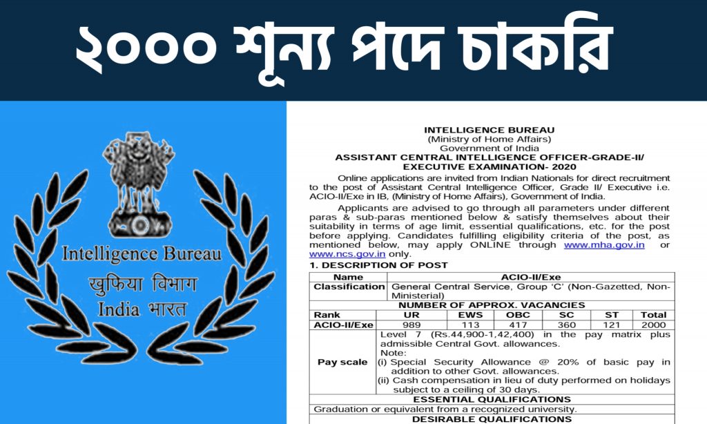 IB ACIO Recruitment: আপনি কি গ্রুপ-সি পদের চাকরি খুঁজছেন? তাহলে আপনার জন্য রয়েছে সুখবর। গোটা দেশজুড়ে ২০০০ শূন্যপদে গ্রুপ-সি কর্মী নিয়োগের বিজ্ঞপ্তি প্রকাশ করেছে ইন্টেলিজেন্স ব্যুরো (Intelligence Bureau, IB)। এটি হলো একটি কেন্দ্রীয় সরকারের চাকরি। এই সমস্ত পদগুলিতে আবেদন করার জন্য আবেদনকারীকে অবশ্যই ভারতীয় নাগরিক হতে হবে। ইতিমধ্যেই অনলাইনে আবেদন প্রক্রিয়া শুরু হয়েছে। পশ্চিমবঙ্গের বিভিন্ন শহরে পরীক্ষা কেন্দ্র রয়েছে। IB ACIO Recruitment. Intelligence Bureau ACIO Recruitment