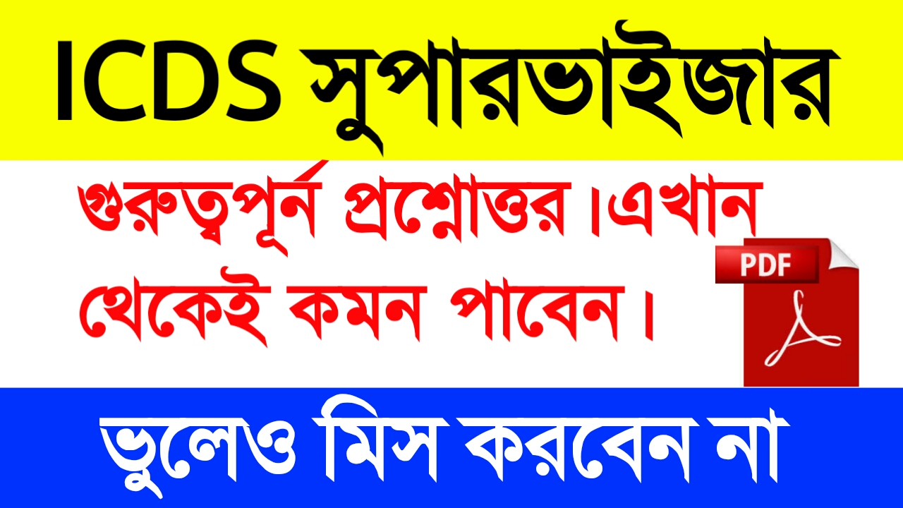 আপনি যদি ICDS সুপারভাইজার এর পরীক্ষার্থী হয়ে থাকেন তাহলে আপনার জন্য রয়েছে বিরাট সুখবর। কারণ “Exam Bangla” ওয়েবসাইটের মাধ্যমে আপনারা ICDS সুপারভাইজার পরীক্ষার জন্য গুরুত্তপূর্ণ প্রশ্নোত্তরেরপিডিএফ পাবেন।