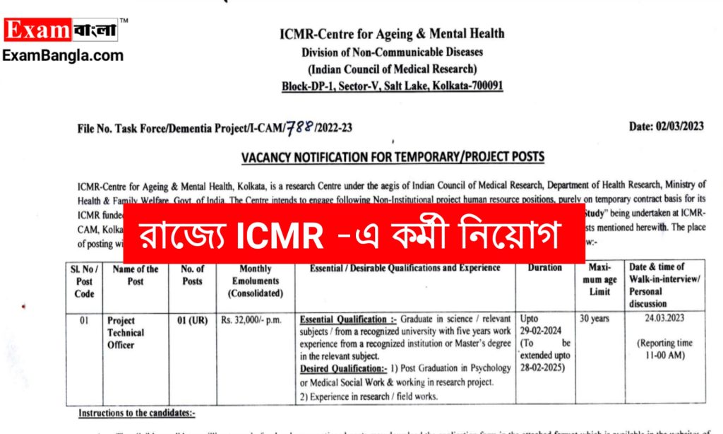 ইন্ডিয়ান কাউন্সিল অফ মেডিকেল রিসার্চ (ICMR) -এর মাধ্যমে রাজ্যে প্রজেক্ট টেকনিক্যাল অফিসার পদে কর্মী নিয়োগের বিজ্ঞপ্তি প্রকাশ করা হয়েছে। যেকোনো ভারতীয় নাগরিক অর্থাৎ পশ্চিমবঙ্গের যেকোনো জেলার প্রার্থীরা এখানে আবেদন করতে পারবেন। আবেদন পদ্ধতি শিক্ষাগত যোগ্যতা সহ বিস্তারিত জানতে নিচে রইলো আজকের এই প্রতিবেদন।