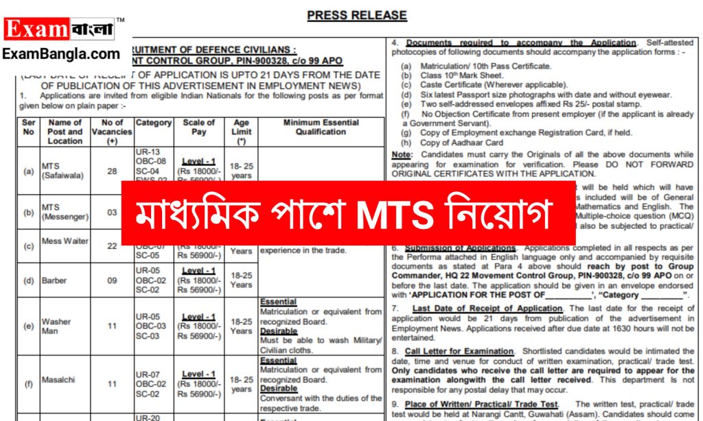 যে সমস্ত পদে নিয়োগ করা হবে সেগুলো হলো- MTS (Safaiwala-28, Massenger-3), Mess Waiter-22, Barber-9, Washer Man-11, Masalchi-11, Cooks-51