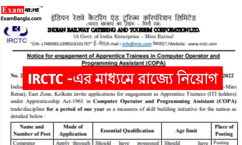 রাজ্যে ইন্ডিয়ান রেলওয়ে ক্যাটারিং এন্ড ট্যুরিজম কর্পোরেশন লিমিটেড বিনামূল্যে প্রশিক্ষণের মাধ্যমে কম্পিউটার অপারেটর পদে কর্মী নিয়োগের বিজ্ঞপ্তি প্রকাশ করা হয়েছে। যেকোনো ভারতীয় নাগরিক অর্থাৎ পশ্চিমবঙ্গের যেকোনো জেলার প্রার্থীরা এখানে আবেদন করতে পারবেন। আবেদন পদ্ধতি শিক্ষাগত যোগ্যতা সহ বিস্তারিত জানতে নিচে রইলো আজকের এই প্রতিবেদন।