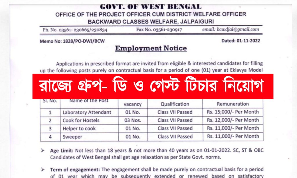 আবেদনপত্র জমা দেওয়ার ঠিকানা- Project Officer cum District Welfare Officer, Backward Classes Welfare & Tribal Devlopment Department, Sivaji Road, Hakimpara, PO & District- Jalpaiguri, Pin- 735101
