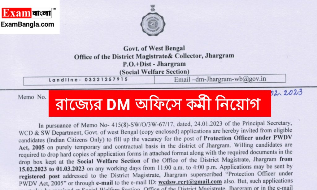 রাজ্যের ডিস্ট্রিক্ট ম্যাজিস্ট্রেট অফিসে চুক্তিভিত্তিতে প্রটেকশন অফিসার পদে কর্মী নিয়োগের বিজ্ঞপ্তি প্রকাশ করা হয়েছে। যেকোনো ভারতীয় নাগরিক অর্থাৎ পশ্চিমবঙ্গের যেকোনো জেলার প্রার্থীরা এখানে আবেদন করতে পারবেন। আবেদন পদ্ধতি শিক্ষাগত যোগ্যতা সহ বিস্তারিত জানতে নিচে রইলো আজকের এই প্রতিবেদন।