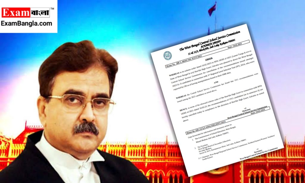 গতকাল বিচারপতি অভিজিৎ গঙ্গোপাধ্যায় স্কুল সার্ভিস কমিশনকে নির্দেশ দিয়েছিলেন রাজ্যে গ্রুপ ডি পদে অযোগ্যভাবে নিয়োগ পাওয়া প্রার্থীদের চাকরি বাতিল করতে হবে। এদিন সেই নির্দেশের পরিপ্রেক্ষিতেই তড়িঘড়ি পদক্ষেপ নিল স্কুল সার্ভিস কমিশন। এসএসএসসির তরফে এদিন ১,৯১১ জন অযোগ্য প্রার্থীর সুপারিশপত্র বাতিল করা হয়েছে।