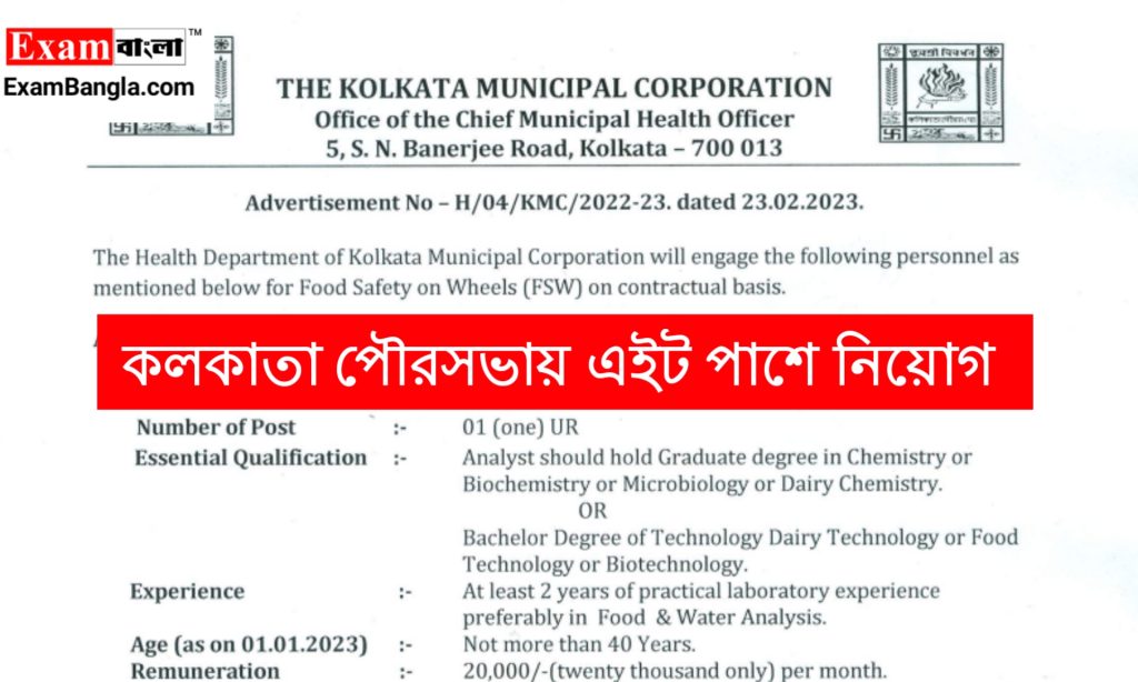 কলকাতা পৌরসভায় এনালিস্ট ও ড্রাইভার পদে কর্মী নিয়োগের বিজ্ঞপ্তি প্রকাশ করা হয়েছে। সরাসরি ইন্টারভিউ মাধ্যমে কর্মী নিয়োগ করা হবে। আবেদন পদ্ধতি শিক্ষাগত যোগ্যতা সহ বিস্তারিত জানতে নিচে রইলো আজকের এই প্রতিবেদন। যেকোনো ভারতীয় নাগরিক অর্থাৎ পশ্চিমবঙ্গের যেকোনো জেলার প্রার্থীরা এখানে আবেদন করতে পারবেন।