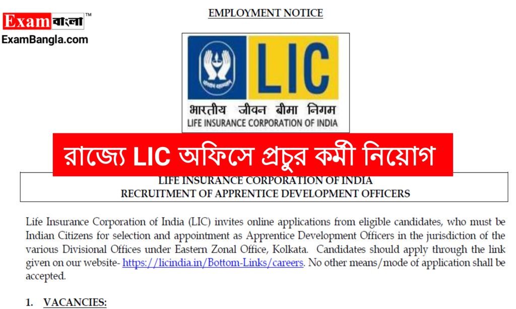 ভারতীয় জীবন বীমা নিগমে অর্থাৎ লাইফ ইন্সুরেন্স কর্পোরেশন অফ ইন্ডিয়া (LIC) -এর তরফে রাজ্যে এপ্রেন্টিস ডেভেলাপমেন্ট অফিসার্স পদে কর্মী নিয়োগের বিজ্ঞপ্তি প্রকাশ করা হয়েছে। যেকোন ভারতীয় নাগরিক অর্থাৎ পশ্চিমবঙ্গের যেকোনো জেলার প্রার্থীরা এখানে আবেদন করতে পারবেন। আবেদন পদ্ধতি শিক্ষাগত যোগ্যতা সহ বিস্তারিত জানতে নিচে রইলো আজকের এই প্রতিবেদন।