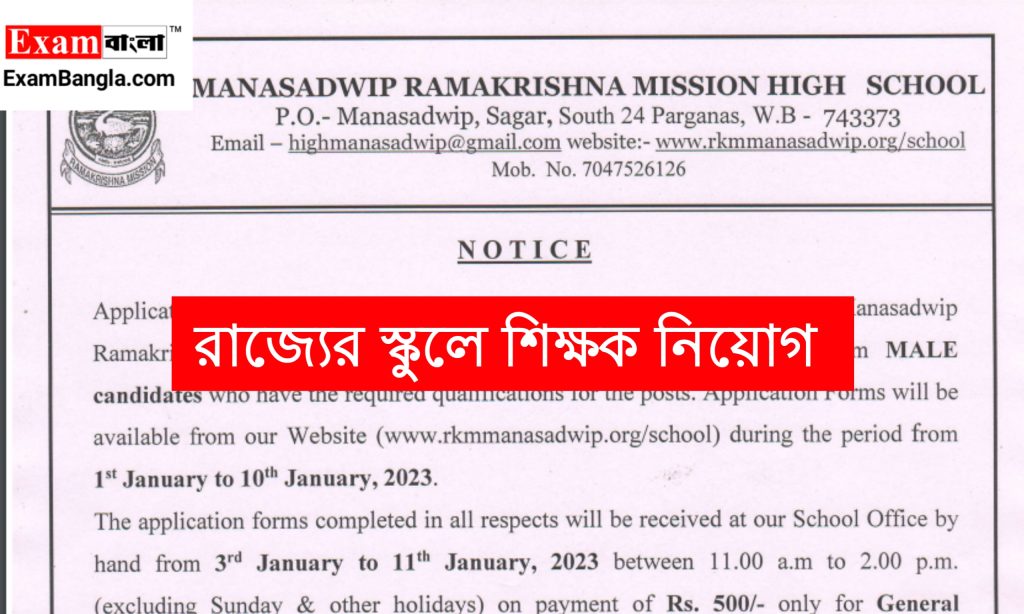 আবেদনপত্র জমা দেওয়ার ঠিকানা- To the Secretary, Manasadwip Ramkrishna Mission High School, P.O- Manasadwip, Sagar Island, District- South 24 Parganas, Pin- 743373