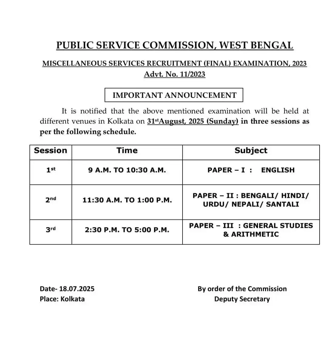 ২০২৩ সালের পশ্চিমবঙ্গ রাজ্যের মিসলেনিয়াস নিয়োগ পদ্ধতি এতদিন ধরে বাকি ছিল। অধীর আগ্রহে এই পরীক্ষার জন্য অপেক্ষা করছিলেন। অবশেষে মেন্স পরীক্ষার দিনক্ষণ ঘোষণা করল পশ্চিমবঙ্গ পাবলিক সার্ভিস কমিশন। আগামী ৩১শে আগস্ট ২০২৫ তারিখে এই পরীক্ষাটি গোটা রাজ্য জুড়ে অনুষ্ঠিত হতে চলেছে। মূলত রাজ্যের বিভিন্ন সরকারি বিদ্যালয়ে বা পাবলিক সার্ভিস কমিশনের অফিসের আয়োজিত হবে এই পরীক্ষা। ঐদিন মোট তিন দফার মাধ্যমে কোন পরীক্ষাটি আয়োজন করা হবে। প্রকাশিত বিজ্ঞপ্তি অনুসারে-
