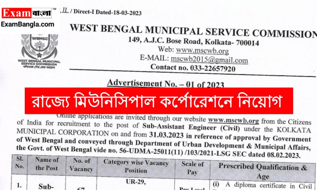 রাজ্যে মিউনিসিপাল সার্ভিস কমিশন (MSCWB) এর মাধ্যমে সাব অ্যাসিস্ট্যান্ট ইঞ্জিনিয়ার পদে কর্মী নিয়োগের বিজ্ঞপ্তি প্রকাশ করা হয়েছে। যেকোনো ভারতীয় নাগরিক অর্থাৎ পশ্চিমবঙ্গের যেকোনো জেলার প্রার্থীরা এখানে আবেদন করতে পারবেন। আবেদন পদ্ধতি শিক্ষাগত যোগ্যতা সহ বিস্তারিত জানতে নিচে রইলো আজকের এই প্রতিবেদন।