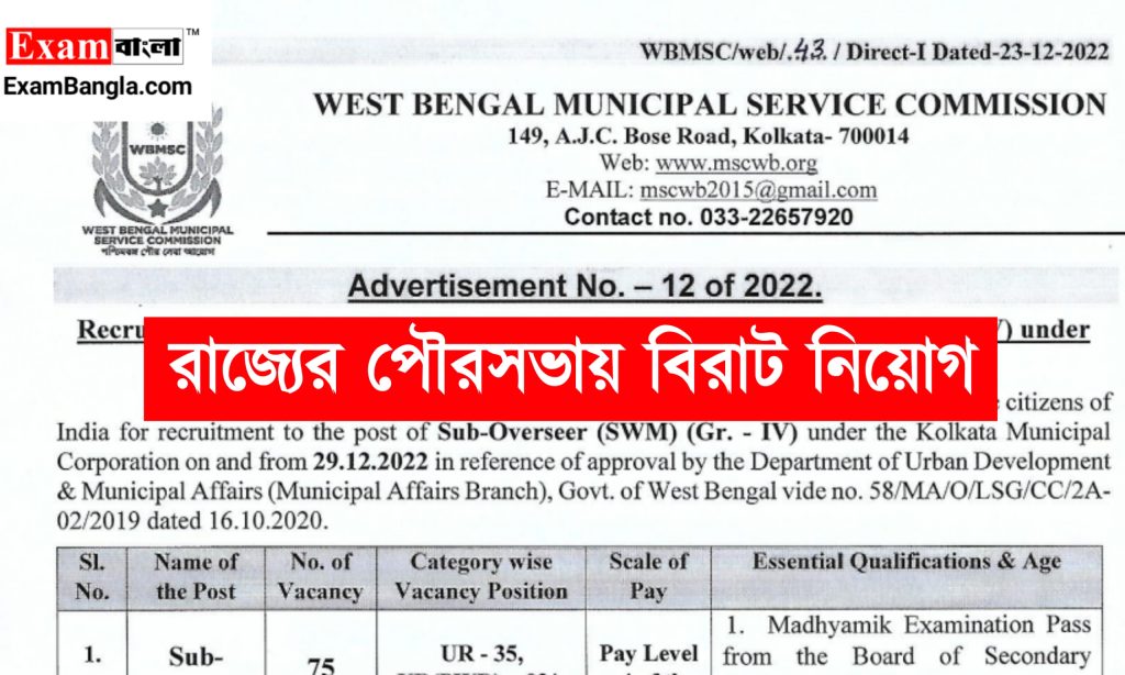 MSCWB Sub Overseer Recruitment: রাজ্যের পৌরসভায় মাধ্যমিক পাশে কর্মী নিয়োগের বিজ্ঞপ্তি প্রকাশ করা হয়েছে। যেকোনো ভারতীয় নাগরিক অর্থাৎ পশ্চিমবঙ্গের যেকোনো জেলার প্রার্থীরা এখানে আবেদন করতে পারবেন। আবেদন পদ্ধতি শিক্ষাগত যোগ্যতা সহ বিস্তারিত জানতে নিচে রইলো আজকের এই প্রতিবেদন।