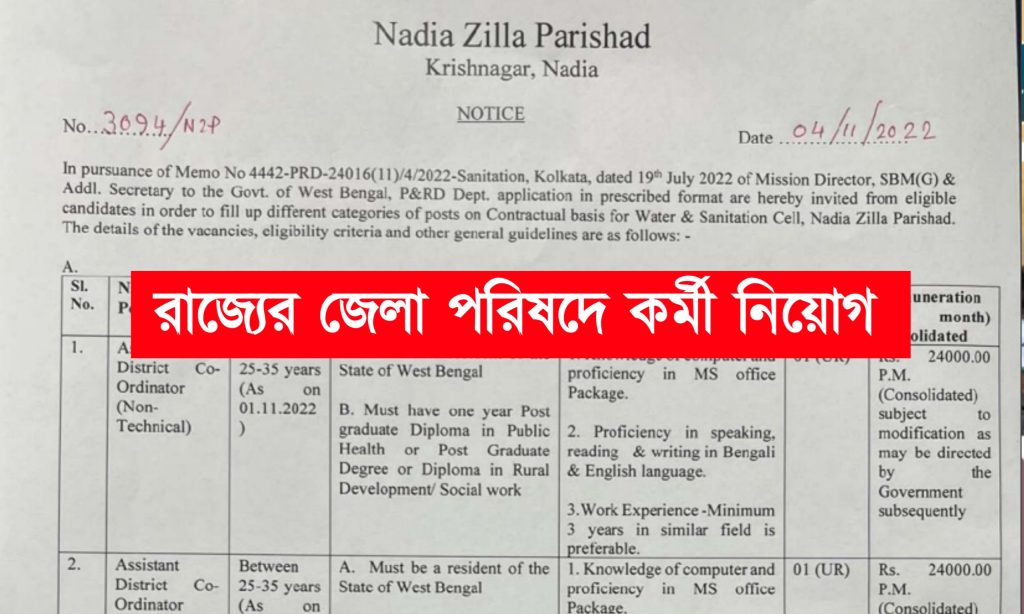 রাজ্যের জেলা পরিষদে চুক্তিভিত্তিতে অ্যাসিস্ট্যান্ট ডিস্ট্রিক্ট কো-অর্ডিনেটর পদে কর্মী নিয়োগের বিজ্ঞপ্তি প্রকাশ করা হয়েছে। যে কোন ভারতীয় নাগরিক অর্থাৎ পশ্চিমবঙ্গের যেকোনো জেলার প্রার্থীরা আবেদন করতে পারবেন। আবেদন পদ্ধতি শিক্ষাগত যোগ্যতা সহ বিস্তারিত জানতে নিচে রইলো আজকের এই প্রতিবেদন।
