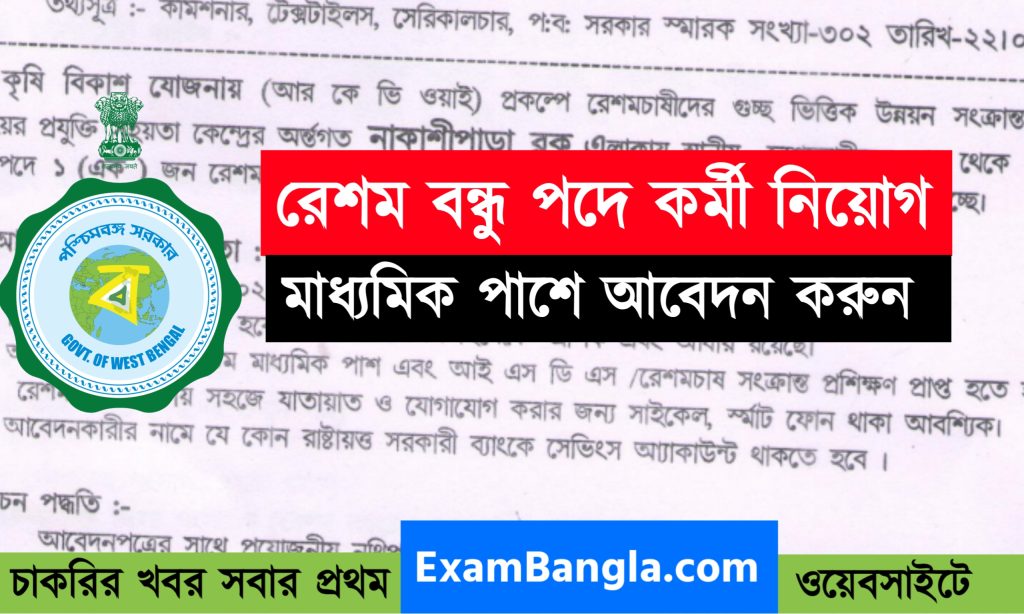 রাজ্যে আবারও রেশম চাষীদের উন্নয়ন ভিত্তিক প্রকল্পে কাজ করার জন্য রেশম বন্ধু পদে কর্মী নিয়োগের বিজ্ঞপ্তি প্রকাশিত হয়েছে। রাজ্যের বস্ত্র দপ্তরের অধীনস্থ সেরিকালচার কমিশনারের অফিস থেকে এই বিজ্ঞপ্তি দেওয়া হয়েছে। সম্পূর্ণ এক বছরের জন্য অস্থায়ী পদে প্রার্থী নিয়োগ করা হবে। সমস্ত ভারতীয় নাগরিক অর্থাৎ পশ্চিমবঙ্গের যেকোন জেলা থেকে প্রার্থীরা আবেদন করতে পারবেন।