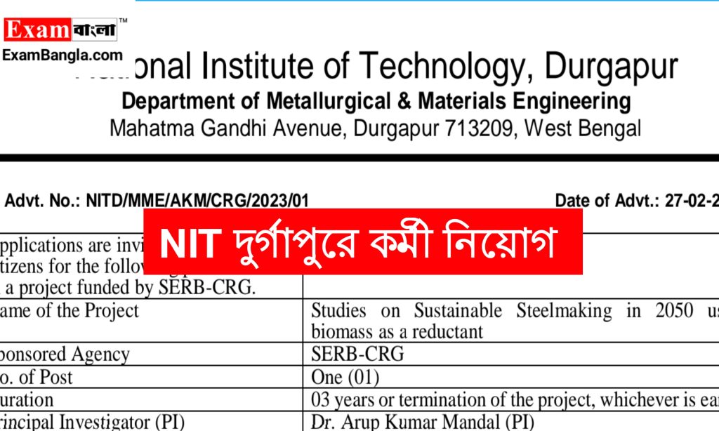 ন্যাশনাল ইনস্টিটিউট অফ টেকনোলজি (NIT) দুর্গাপুরে প্রজেক্ট অ্যাসিস্ট্যান্ট পদে কর্মী নিয়োগের বিজ্ঞপ্তি প্রকাশ করা হয়েছে। যেকোনো ভারতীয় নাগরিক অর্থাৎ পশ্চিমবঙ্গের যেকোনো জেলার প্রার্থীরা এখানে আবেদন করতে পারবেন। আবেদন পদ্ধতি শিক্ষাগত যোগ্যতা সহ বিস্তারিত জানতে নিচে রইলো আজকের এই প্রতিবেদন।