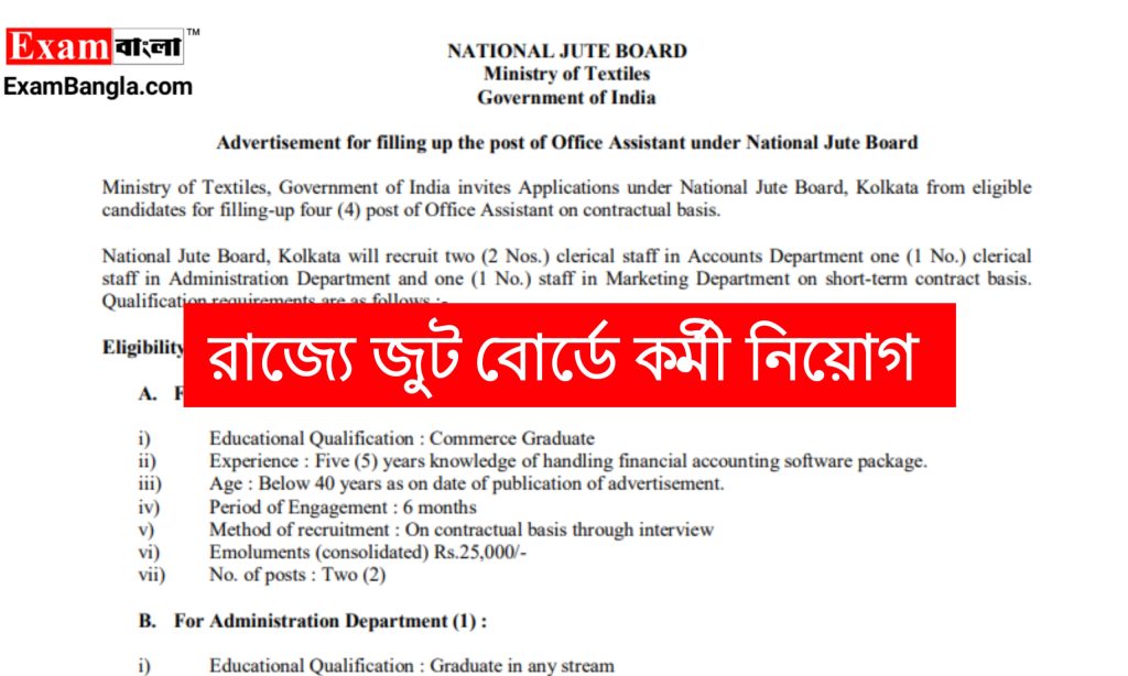 কেন্দ্রীয় সরকারের ন্যাশনাল জুট বোর্ডে কর্মী নিয়োগের বিজ্ঞপ্তি প্রকাশ করা হয়েছে। যেকোনো ভারতীয় নাগরিক অর্থাৎ পশ্চিমবঙ্গের যেকোনো জেলার প্রার্থীরা এখানে আবেদন করতে পারবেন। আবেদন পদ্ধতি শিক্ষাগত যোগ্যতা সহ বিস্তারিত জানতে নিচে রইলো আজকের এই প্রতিবেদন।
