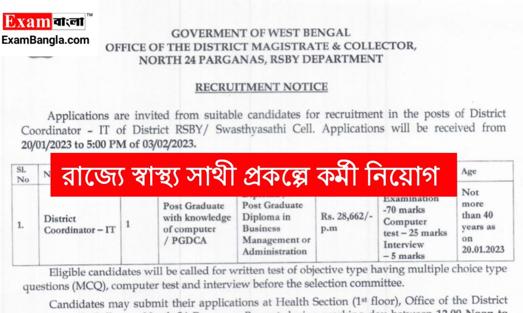 রাজ্যের স্বাস্থ্য সাথী প্রকল্পের মাধ্যমে ডিসট্রিক্ট কো-অর্ডিনেটর কর্মী নিয়োগের বিজ্ঞপ্তি প্রকাশ করা হয়েছে। আবেদন পদ্ধতি শিক্ষাগত যোগ্যতা সহ বিস্তারিত জানতে নিচে রইলো আজকের এই প্রতিবেদন। WB Swasthyasathi Cell Recruitment 2023