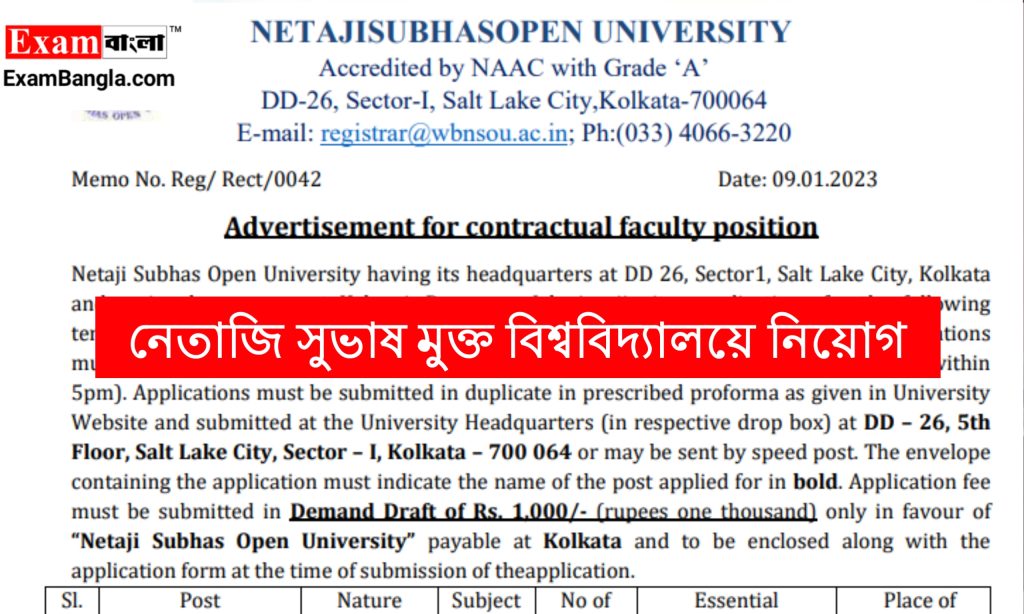 রাজ্যের নেতাজি সুভাষ ওপেন ইউনিভার্সিটিতে অ্যাসিস্ট্যান্ট প্রফেসর নিয়োগের বিজ্ঞপ্তি প্রকাশ করা হয়েছে। যেকোনো ভারতীয় নাগরিক অর্থাৎ পশ্চিমবঙ্গের যেকোনো জেলার প্রার্থীরা এখানে আবেদন করতে পারবেন। আবেদন পদ্ধতি শিক্ষাগত যোগ্যতা সহ বিস্তারিত জানতে নিচে রইলো আজকের এই প্রতিবেদন।