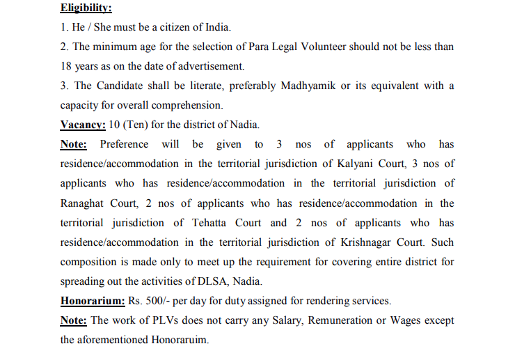 3.Date of interview will be notified later in the official notice board of the District Nadia and District Legal Services Authority, Nadia as well as uploaded in the official website i.e https://districts.ecourts.gov.in/nadia and http://dlsanadia.org/.