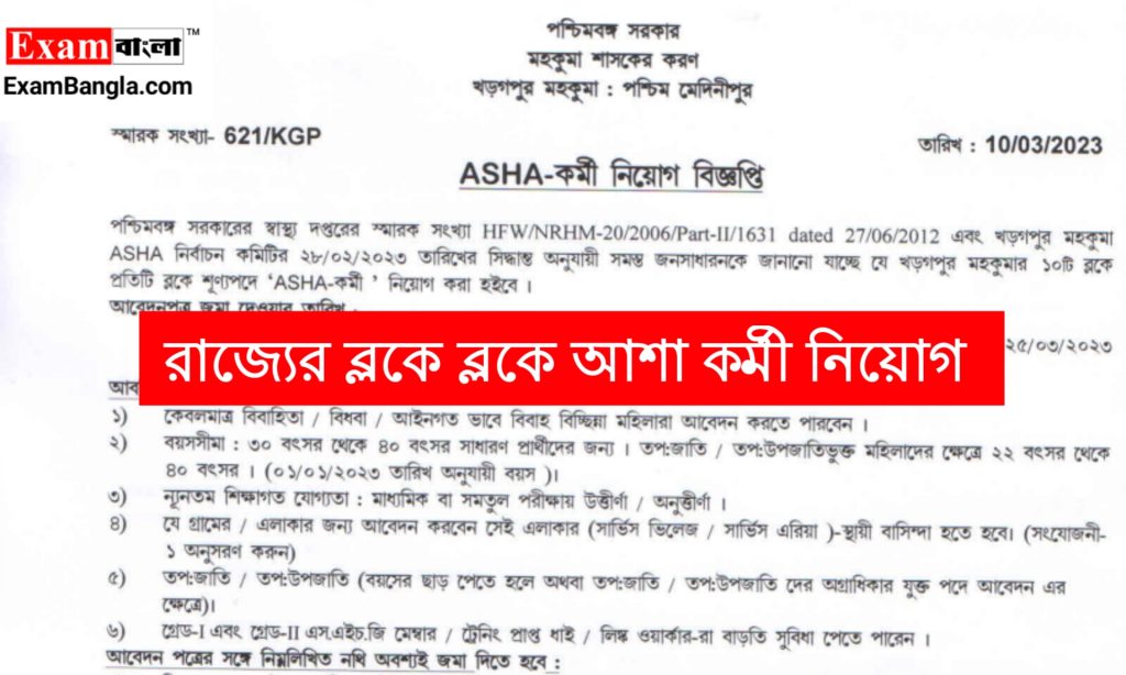রাজ্যে সরকারের অধীনস্থ জাতীয় স্বাস্থ্য মিশনের আওতায় চুক্তিভিত্তিতে পঞ্চায়েত এলাকায় আশা কর্মী পদে কর্মী নিয়োগের বিজ্ঞপ্তি প্রকাশ করা হয়েছে। মাধ্যমিক পাশ শিক্ষিত যোগ্যতায় আবেদন করা যাবে। আবেদন পদ্ধতি শিক্ষাগত যোগ্যতা সহ বিস্তারিত জানতে নিচে রইলো আজকের এই প্রতিবেদন।