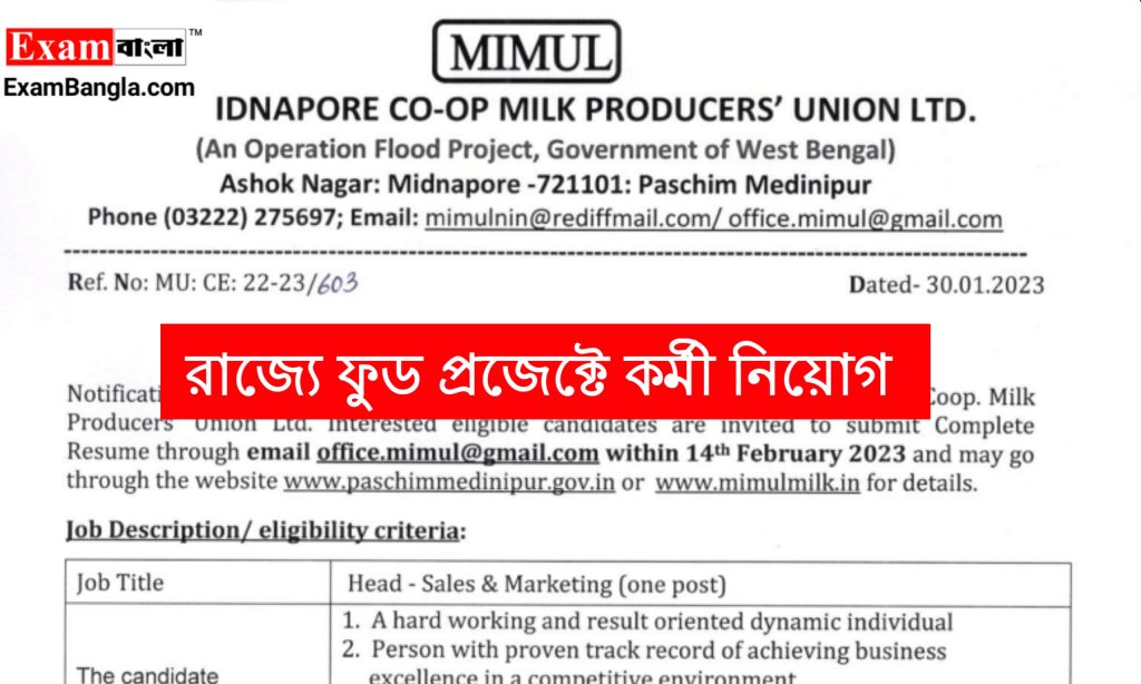 রাজ্য সরকারের ফুড প্রজেক্টের মাধ্যমে কো-অপারেটিভ মিল্ক প্রোডাক্ট ইউনিটে কর্মী নিয়োগের বিজ্ঞপ্তি প্রকাশ করা হয়েছে। যেকোনো ভারতীয় নাগরিক অর্থাৎ পশ্চিমবঙ্গের যেকোনো জেলার প্রার্থীরা এখানে আবেদন করতে পারবেন। আবেদন পদ্ধতি শিক্ষাগত যোগ্যতা সহ বিস্তারিত জানতে নিচে রইলো আজকের এই প্রতিবেদন।