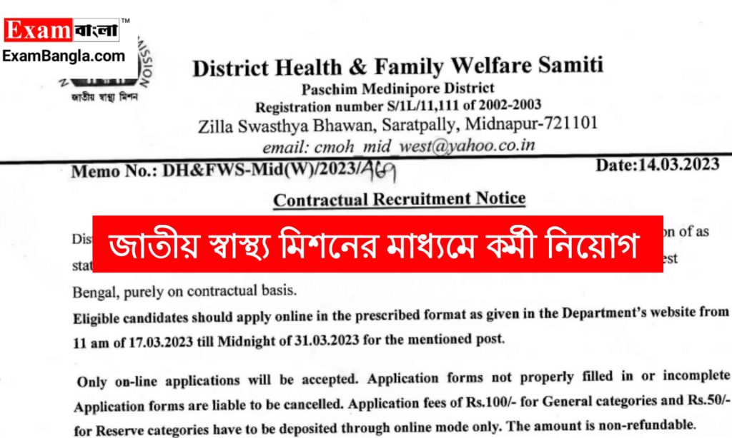 জাতীয় স্বাস্থ্য মিশনের মাধ্যমে জেলা স্বাস্থ্য ও পরিবার কল্যাণ দপ্তরের তরফে ফার্মাসিস্ট পদে নিয়োগের বিজ্ঞপ্তি প্রকাশ করা হয়েছে। যেকোনো ভারতীয় নাগরিক অর্থাৎ পশ্চিমবঙ্গের যেকোনো জেলার প্রার্থীরা এখানে আবেদন করতে পারবেন। আবেদন পদ্ধতি শিক্ষাগত যোগ্যতা সহ বিস্তারিত জানতে নিচে রইলো আজকের এই প্রতিবেদন।